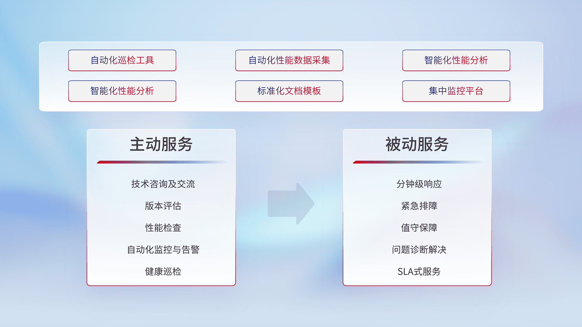 智能化工具和标准化文档,,保障服务质量,,提供主动服务(包含技术咨询、、、、版本评估、、、、性能检查、、、自动化监控与告警、、健康巡检)和被动服务包含(分钟级响应、、、、紧急排障、、值守保障、、、、问题诊断解决、、、、SLA服务)。。。。